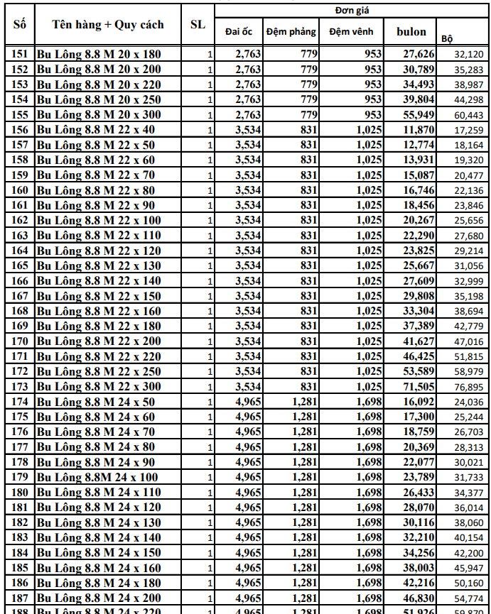 Quy cách thông số bulông F10TĐường kính : M4 - M64 Bước ren : 01 - 06 Loại ren : -DIN 933 (ren suốt) -DIN 931(ren nửa) Chiều dài : 10 - 300 mm Bề mặt : -Ôxi đen -Mạ điện phân trắng -Mạ điện phân vàng -Mạ điện phân tro(đục) -Mạ nhúng nóng Giác : Sáu cạnh Chất liệu : Thép Giới hạn bền kéo (N/mm2): 1000-1100 Nhập khẩu :Đài Loan