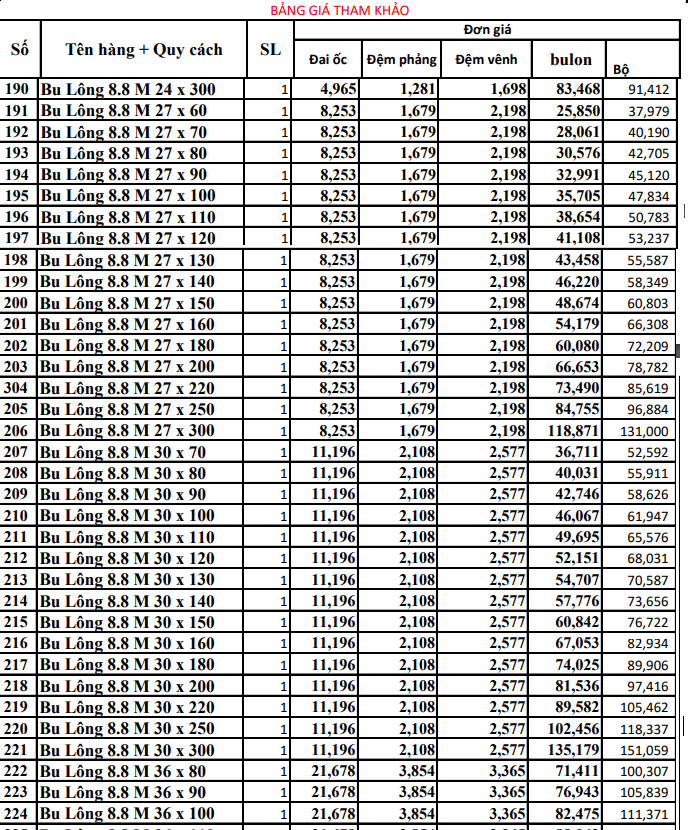 Báo Giá Tham Khảo Bulông 8.8