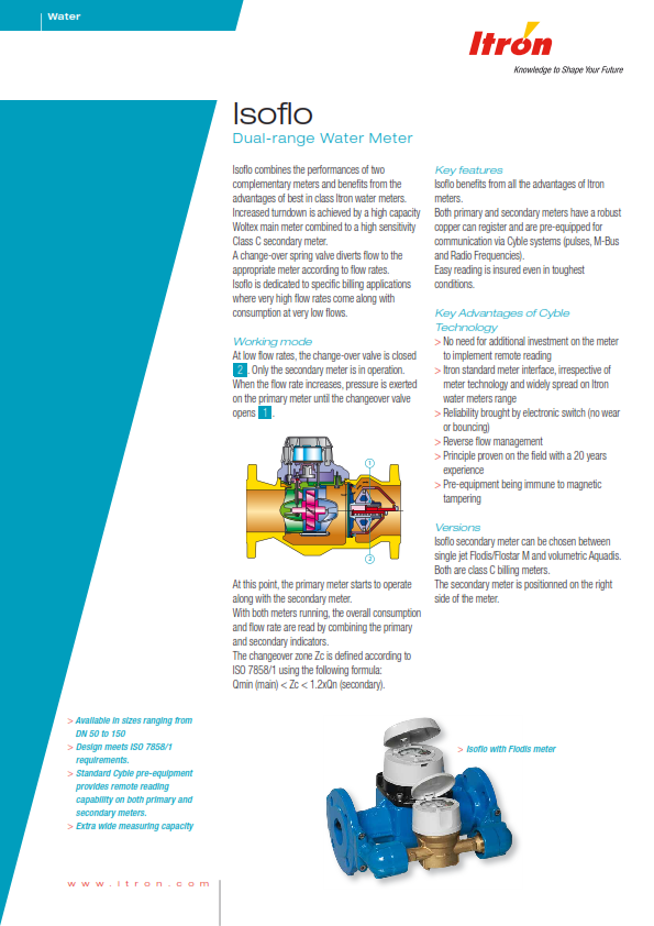ISOFLO là đồng hồ nước kiểu mẹ bồng con, đo được hai lưu lượng kết hợp các công nghệ Woltmann Cấp B (Woltex) đo ngang và Cấp C đơn tia (Flostar M) hoặc thể tích (Aquadis). Dải sản phẩm Isoflo có phạm vi đo cực kỳ rộng với độ bền hoàn hảo ở các mức lưu lượng cao và độ chính xác hoàn hảo ở các mức lưu lượng thấp. ISOFLO được trang bị sẵn để lắp thiết bị đọc từ xa bằng Cyble.