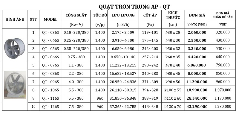 - Đường kính guồng cách của quạt (mm): 400 - 1.400 hoặc lớn hơn